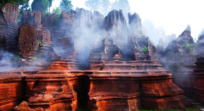 三、天下唯一的自然奇观 走进古丈红石林国家地质公园,就如同走进了一个梦幻般的世界,成柱成片的红色石林、石崖、石墙、石峰,分布在群山峻岭之中。石林造型千姿百态,有的象总统头像,巨人屹立,有的如神龟探海,鹰击长空;有的像紫荆花怒放,海洋冰床,有的像城堡峰塔,大厦高楼,有的如楼兰古城、驼铃声声,有的像乳燕待哺、蜗牛搬家、有的如七彩迷宫、利剑刺空;有的像航母巡游、石兵列阵;有的如少女出浴、观音坐莲;有的像石鞭候主、灵龟探海;有的如棕熊迎客、天狗吠日;有的如水獭望云、母鸡捣窝……尤以“大地剧场”、“巨人园”、“古城故宫”为奇石绝景中的最佳。